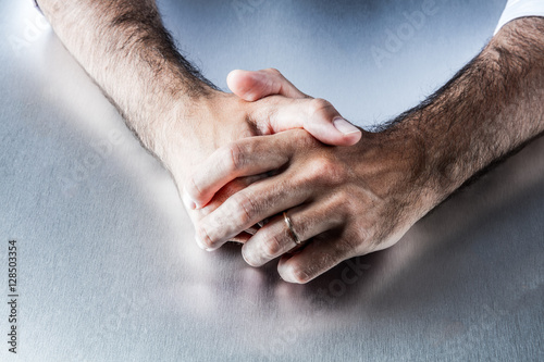 © STUDIO GRAND WEB, Fototapeta premium anonymous male arms showing symbol of his engagement and wedding ring
