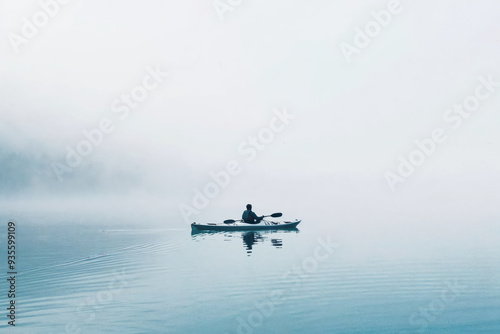 Fototapeta premium Anonymous paddler in a serene, foggy waterscape. Generative AI image