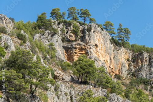 Naklejka premium Ansicht aus dem Nationalpark Krka mit Bäumen und Sträuchern an steiler Felswand