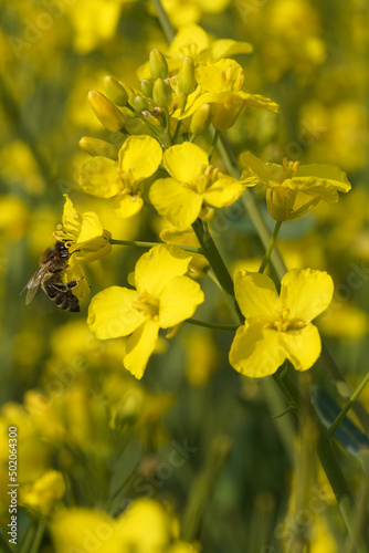 Obraz premium Ansichten einer Biene welche sich an Rapsblüten nährt