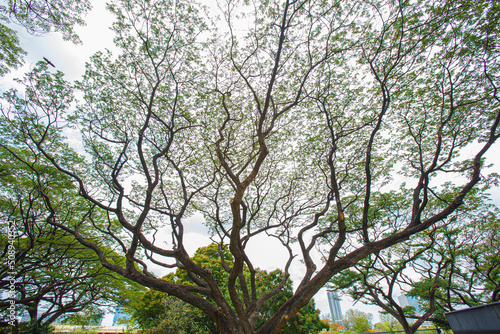 © Apichart, Fototapeta premium Ant's eyes view beautiful top of the big tree branches, stems and leaves