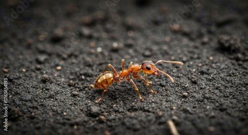 © AW, Fototapeta premium Ant walks on dirt. Close-up showing detailed body and surrounding terrain
