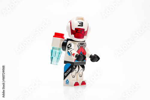 © yalcinsonat, Obraz premium Antalya, Turkey - July 21, 2025: Close-up of a futuristic space-themed Lego minifigure on white background