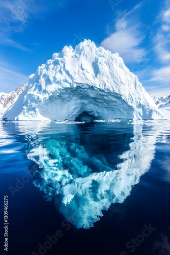© DEWI, Obraz premium Antarctic iceberg with cave, reflecting in calm ocean water under blue sky.