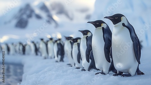 © Auraclicks, Obraz premium Antarctic landscape dotted adorable Emperor Penguins Aptenodytes forsteri huddling together warmth vast expanse of ice snowcapped mountain distance
