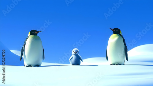 © creative, Naklejka premium Antarctic penguin family on snowy landscape, clear sky background, perfect for children's book illustration
