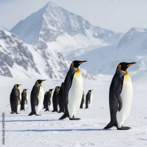 Fototapeta premium Antarctic Royalty: A Regiment of Emperor Penguins Against Majestic Snowy Peaks
