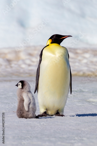 Fototapeta premium Antarctica Snow Hill. A very small chick stands next to an adult.