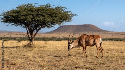 Naklejka premium Antelope grazing in African savanna under acacia tree