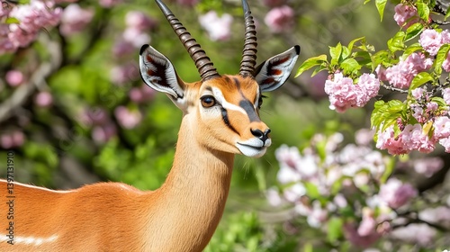 © Neungruedee, Naklejka premium Antelope Standing Amidst Blooming Flowers in a Vibrant Landscape