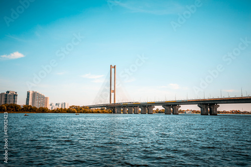 © popovatetiana, Naklejka premium Antenna of the south bridge, the city of Kiev Ukraine. South bridge of the city of Kiev. Dnieper river, bridge over the river. Summer time