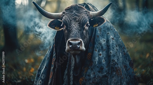 Naklejka premium Anthropomorphic cattle wearing robe. Cattle shaman. Generative AI