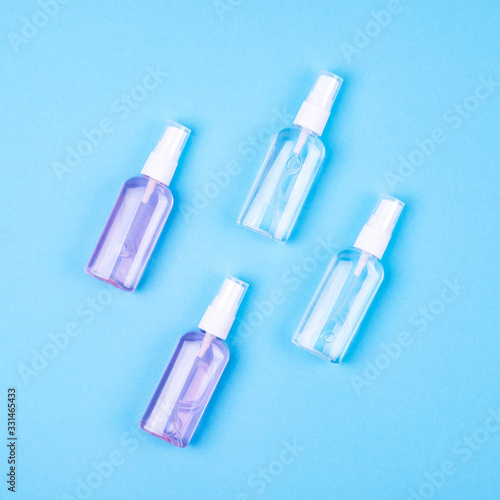 Naklejka premium Antibacterial antiseptic spray for hands sanitizer on blue...