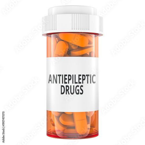 Fototapeta premium Antiepileptic drugs pill bottle, orange prescription container. 3D rendering