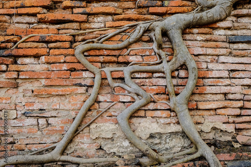 © googibga, Obraz premium Antiguo,Tree trunks climb on the red brick wall