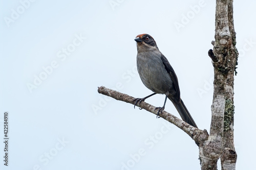Fototapeta premium Antioquia Brush-finch (Atlapetes blancae) perched on a pole on top of a tree in Santa Rosa de Osos