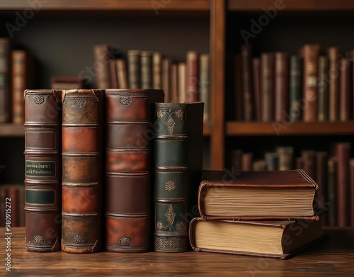 Naklejka premium Antique Binders: A Timeless Collection of Leather-Bound Volumes