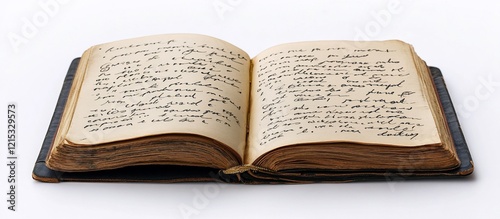 Fototapeta premium Antique book open, handwritten text, white background, history study