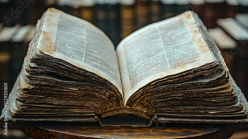 © cris, Obraz premium Antique book open, library background, knowledge, research