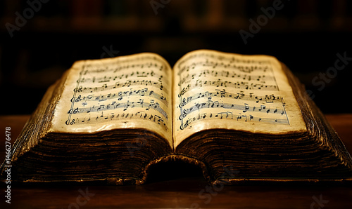 Fototapeta premium Antique book open pages warm light dark background