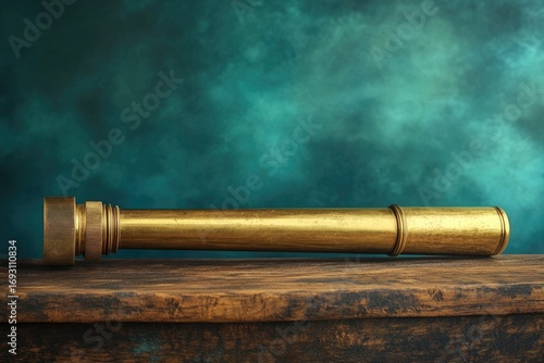 © Design, Obraz premium Antique brass telescope rests on a wooden surface against a teal background, evoking nautical exploration.