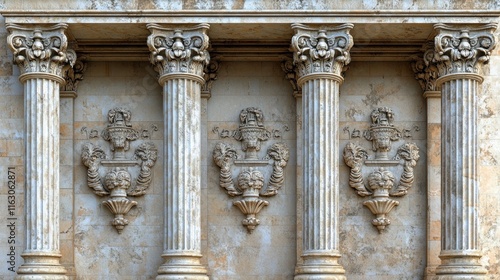 Obraz premium Antique columns and ornate carvings on a weathered stone wall.