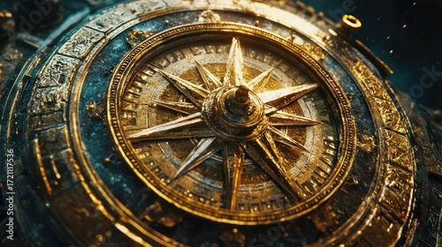 © Nuriya, Obraz premium Antique Golden Compass Nautical Navigation Tool Close Up.