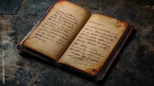 © Artyom, Obraz premium Antique handwritten journal with aged, worn pages on rustic surface