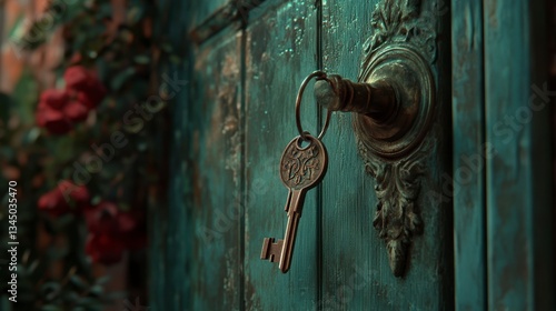 © thenort, Fototapeta premium Antique key in aged teal door, roses in background. Possible use Decorative, illustrative