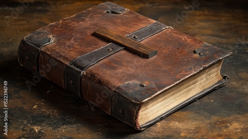 © Ratchanee, Obraz premium Antique Leather Bound Book with Cross on Rustic Wooden Surface