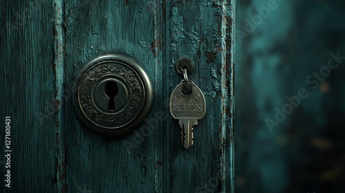 © Dece Std, Fototapeta premium Antique lock and key on weathered teal door