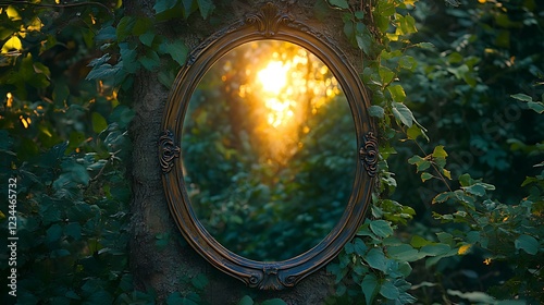 Obraz premium Antique oval mirror reflecting sunset in a lush green forest, nestled within...