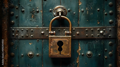 Fototapeta premium Antique Padlock Secures Rustic Wooden Door, Aged Metal
