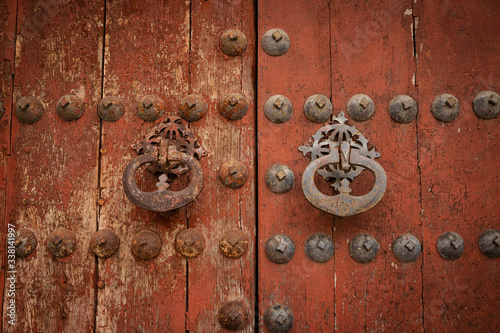 © Jorge Anastacio, Fototapeta premium antique rusty door knockers of an ancient red wooden door