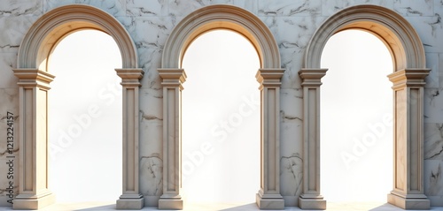 Naklejka premium Antique style white marble arches form classic facade. Empty space between columns. Classic design with three arched openings. Elegant, timeless architecture. Suitable for products, banners,
