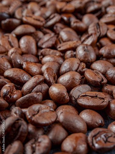 © Mikhail, Naklejka premium Antique vintage retro bronze coffee mill on black wooden board with roasted coffee beans