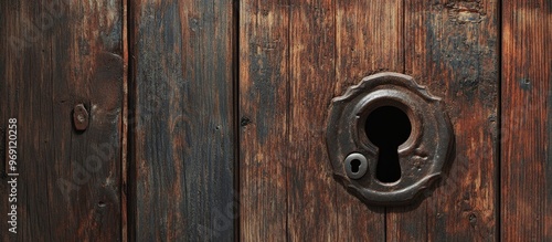 Fototapeta premium Antique wooden door featuring an old keyhole with a key. with copy space...