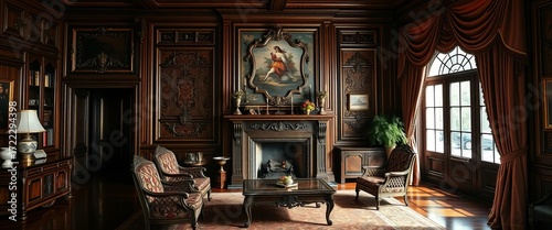 Fototapeta premium Antique wooden furniture, ornate fireplace, plush velvet drapes, lamp, shadows