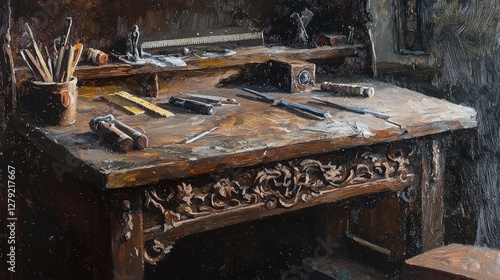 Fototapeta premium Antique workbench, tools, artisan's work space, historical craftsmanship,...