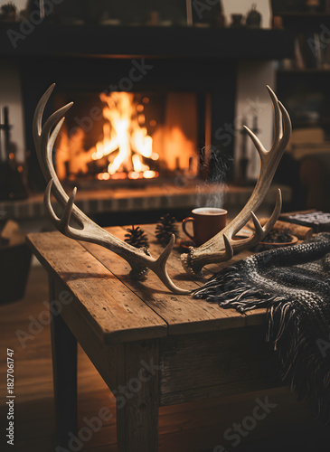 Fototapeta premium Antlers and Mug on Rustic Table by Glowing Fireplace