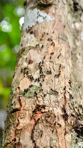 © Larass, Obraz premium Ants crawling on a tree trunk