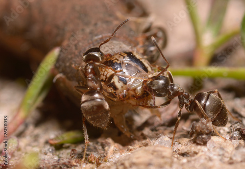 © Yurii Zushchyk, Fototapeta premium Ants pulling a grub gnawing it