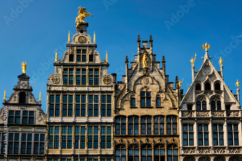 Naklejka premium Antwerp row of 16th century old houses Monumental Guildhouses facades on Grote Markt square. Antwerp, Belgium, Flanders