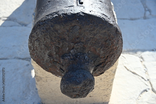 © Miroslaw, Fototapeta premium antyczna żeliwna armata patrzy na miasto z zamku sw barbary w Alicante