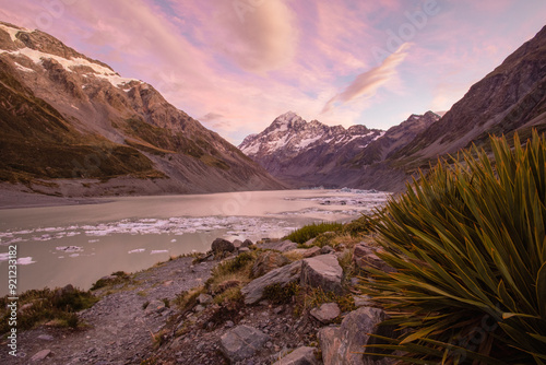 Obraz premium Aoraki Mt. Cook at Sunrise with Hooker Lake in foreground