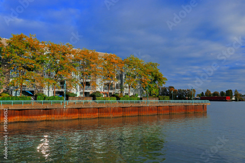 Obraz premium Apartment building and promenade with green bushes and autumn colored trees on the Fraser River waterfront on the background of beautiful sky in Vancouver City