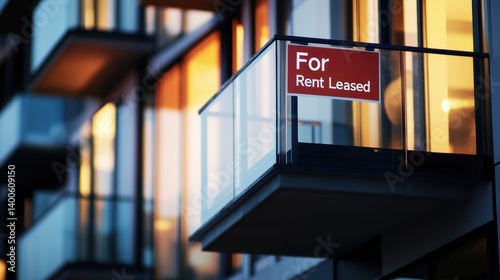 © saefurridhoalghoza, Obraz premium Apartment Building Balcony Displaying 'for Rent Leased' Sign at Sunset