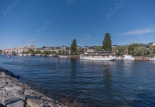 © Hans Baath, Naklejka premium Apartment houses at the water front districts Nacka and Hammarby sjöstad, Canal boat Diana passing for the town Göteborg a sunny summer day in Stockholm