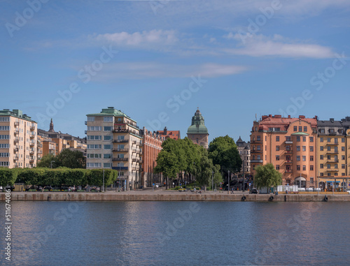 © Hans Baath, Obraz premium Apartment houses at the waterfront and the tower of a court house on the island Kungsholmen a sunny summer day in Stockholm