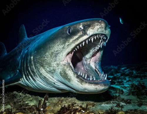 Naklejka premium Apex Predator: A close-up view of a formidable shark, displaying its powerful jaws and rows of razor-sharp teeth in its underwater habitat. A testament to the raw power of the ocean's apex predator.